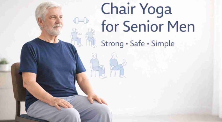 Chair yoga for senior men explained simply. Learn benefits, safe exercises, scientific support, and how older men can stay strong and mobile at home. Chair Yoga for Senior Men (Simple, Strong & Safe Movement)