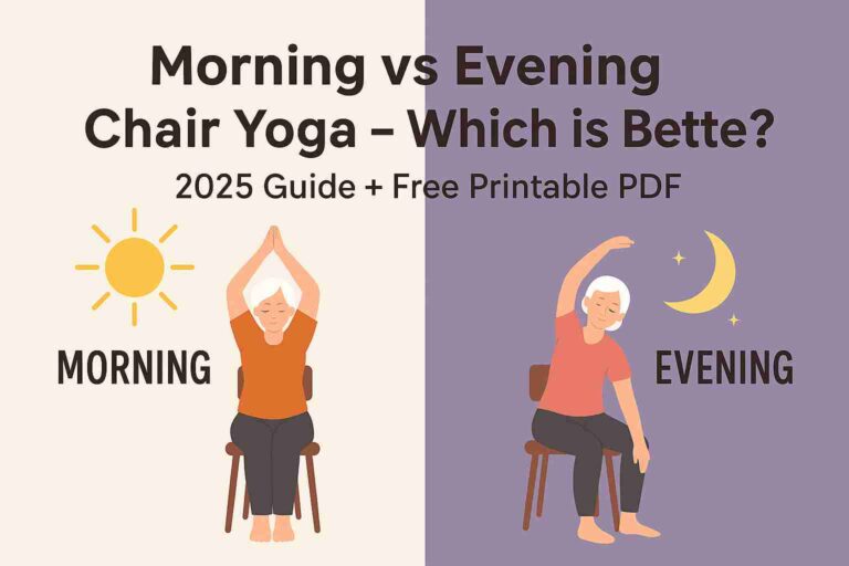 Morning vs evening chair yoga – which is better for seniors? Discover science-backed benefits, pros & cons of both, plus a free printable PDF routine to practice safely. If you’re over 60 and practicing chair yoga, you may have wondered: “Is it better to do yoga in the morning or evening?” Timing matters more than you think.